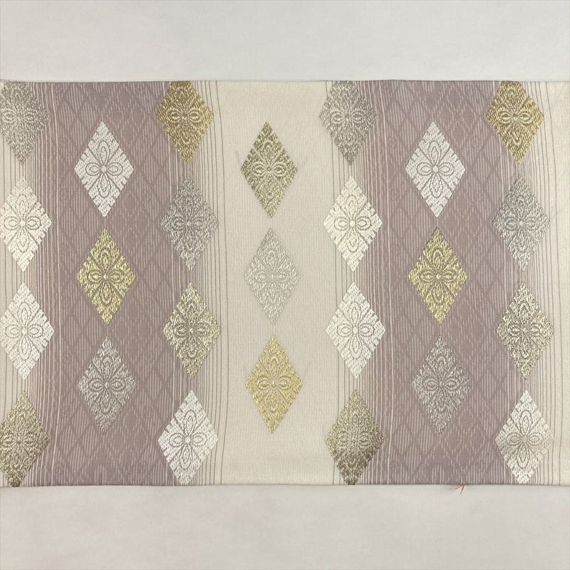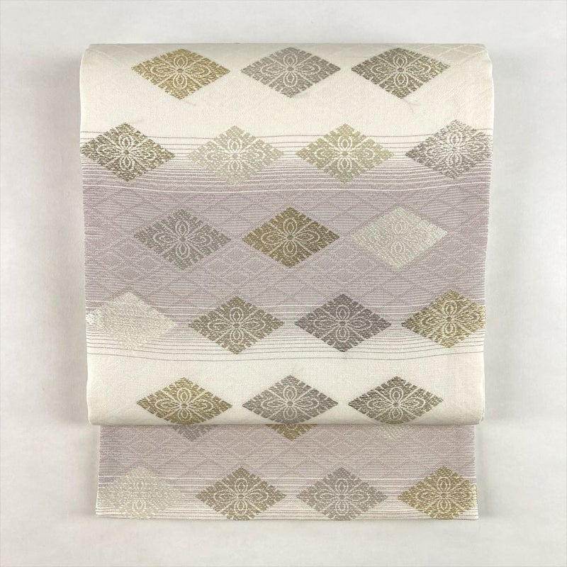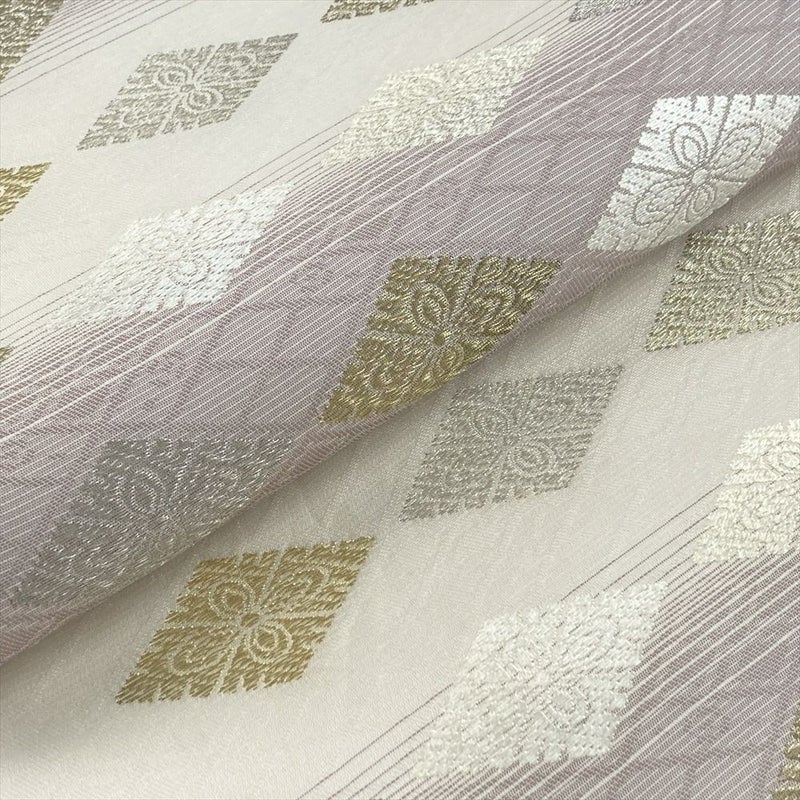 アイボリーに藤色を添え、横段と菱文を織り込んだ袋帯。
