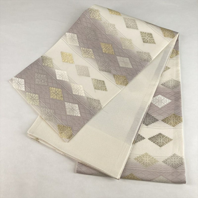 (中古)袋帯 アイボリー 藤色 薄紫 セミフォーマル 六通 織り 金糸 銀糸 横段 菱文 絹