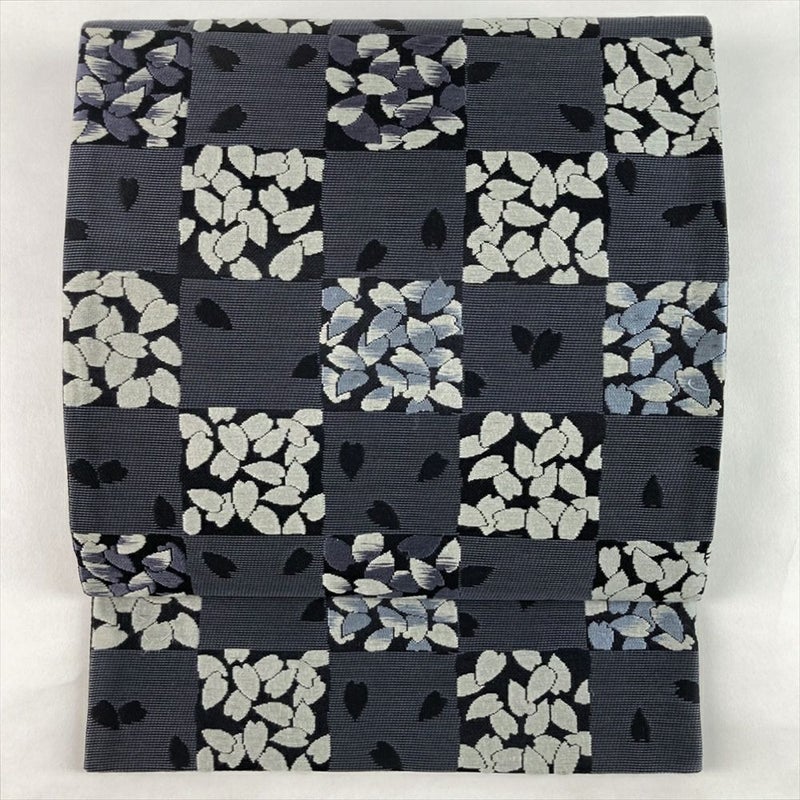 (中古)袋帯 グレー カジュアル セミフォマール 六通 織り 桜 市松 絹