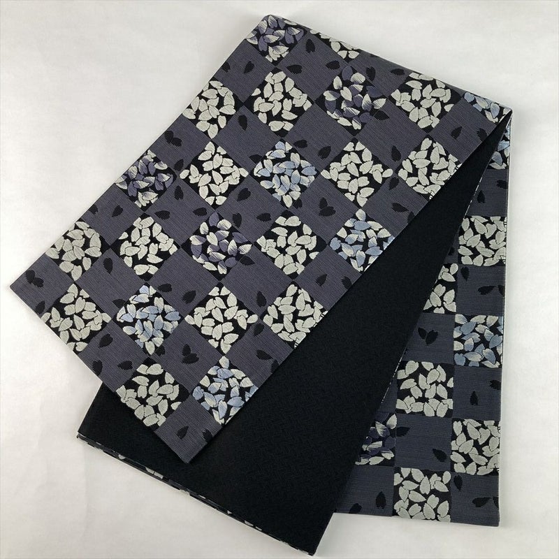 灰青の地に桜と市松模様が織り込まれた、粋な袋帯。