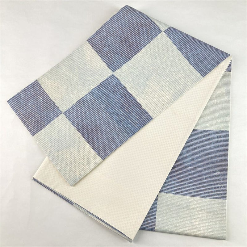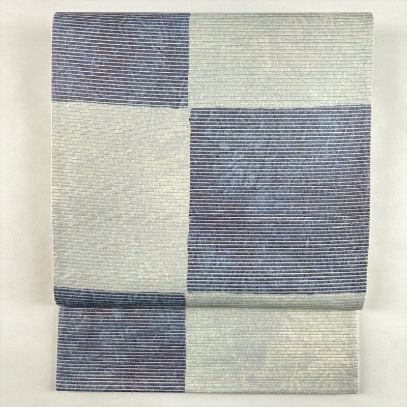 (中古)袋帯 薄青 水色 カジュアル セミフォーマル 六通 織り 和紙箔 市松 絹