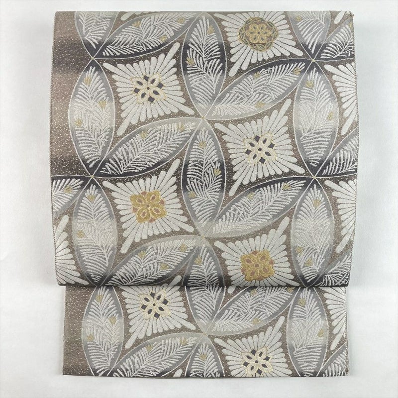 (中古)袋帯 薄灰茶 セミフォマール 六通 織り 菊 松 七宝 絹
