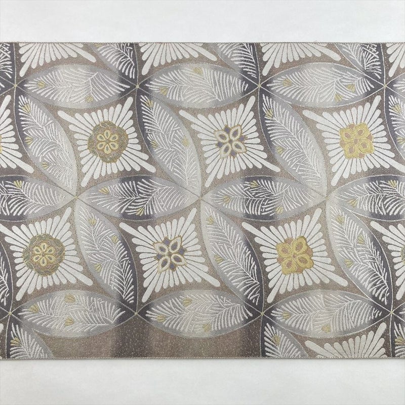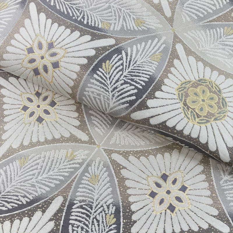 薄灰茶の落ち着いた色味に、菊・松・七宝の文様が織り込まれた袋帯。