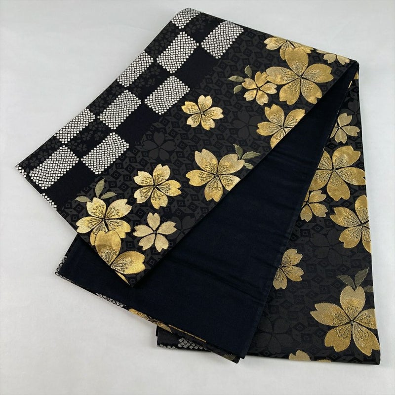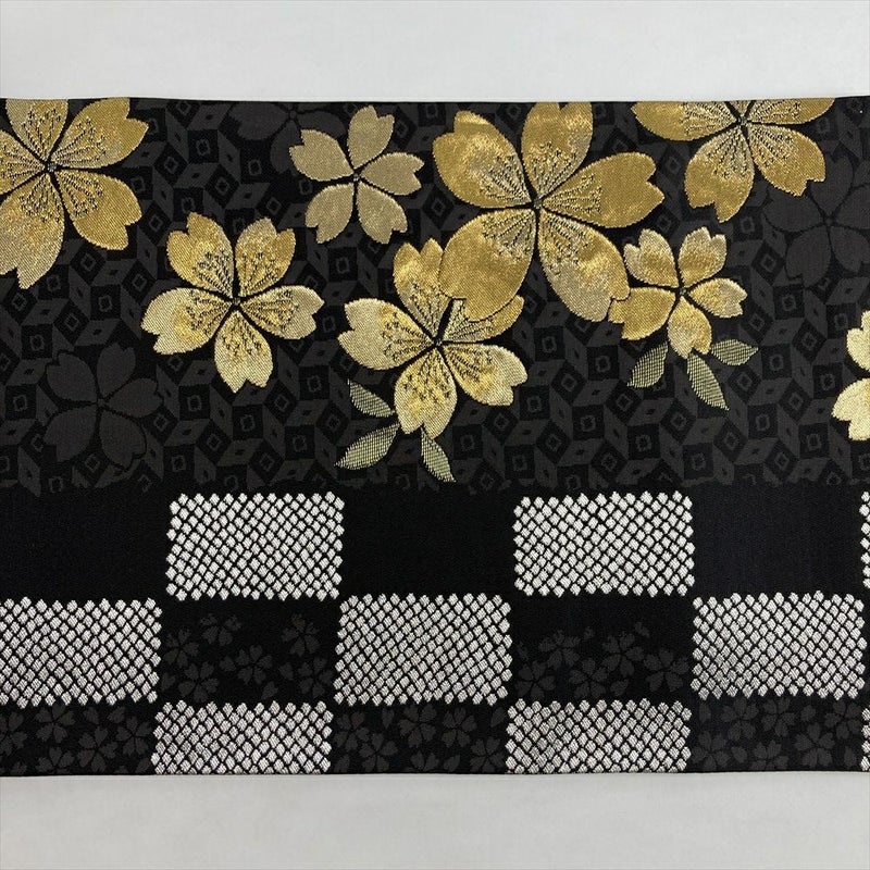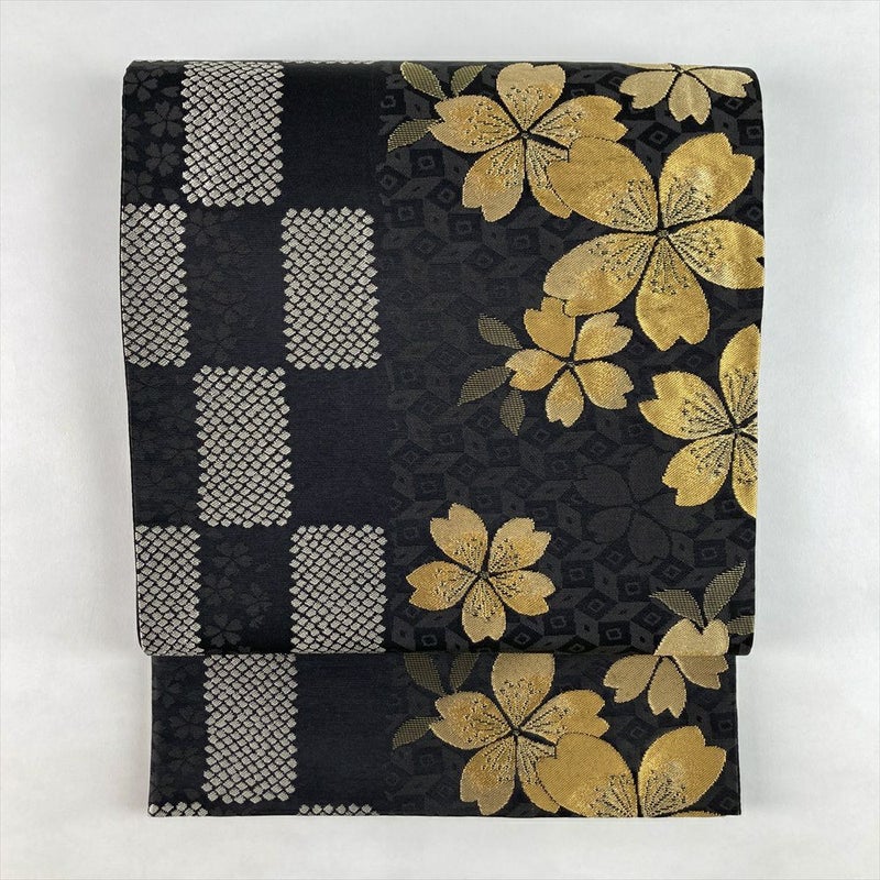 シックな黒地に、金糸で織り上げられた桜と市松模様が華やかに映える袋帯。