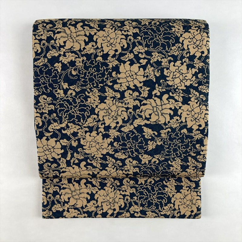 (中古)袋帯 紺 ベージュ カジュアル 全通 織り 唐草 絹