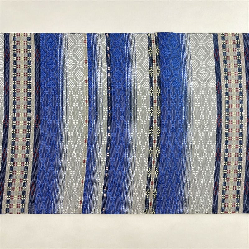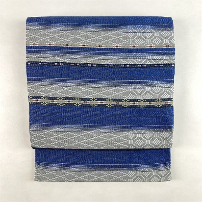(中古)袋帯 紺青 グレー カジュアル 六通 織り 横段 幾何学 立体的 絹