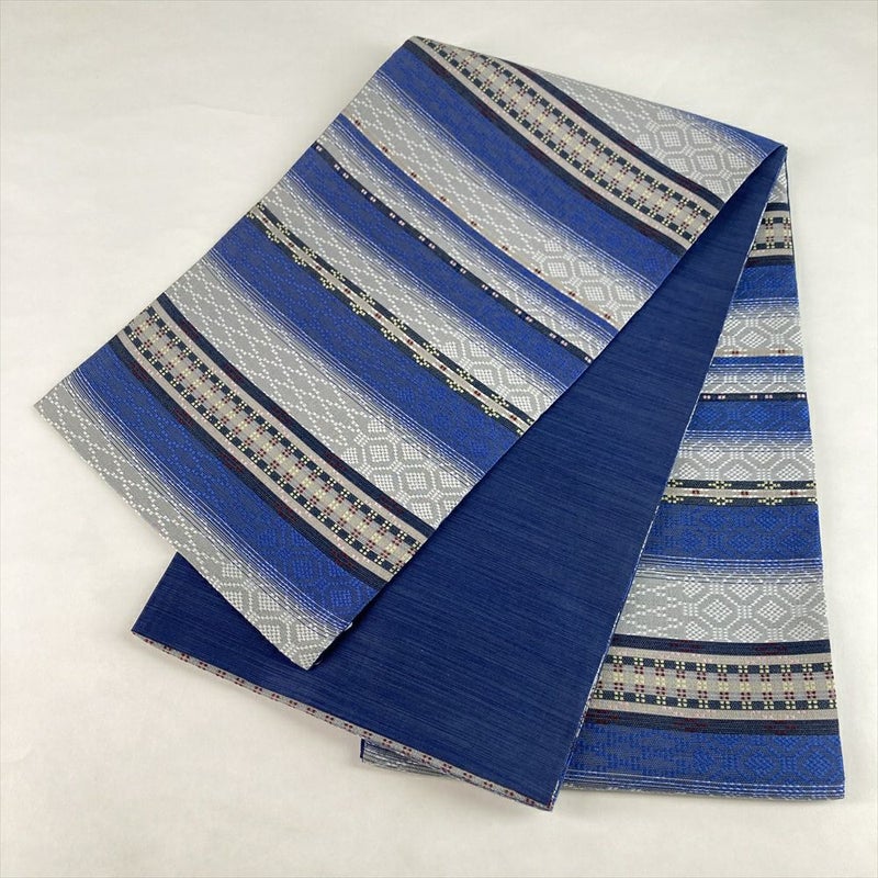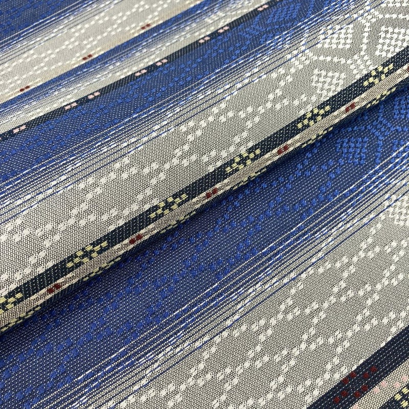 紺青とグレーの横段に、立体感のある幾何学模様を織り込んだデザイン。