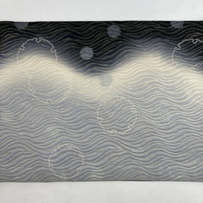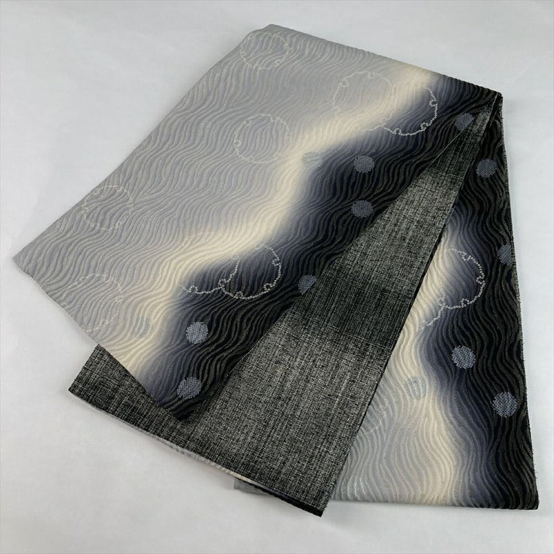 (中古)袋帯 グレー 黒 カジュアル セミフォーマル 全通 織り 金糸 波 雪輪 ぼかし 絹