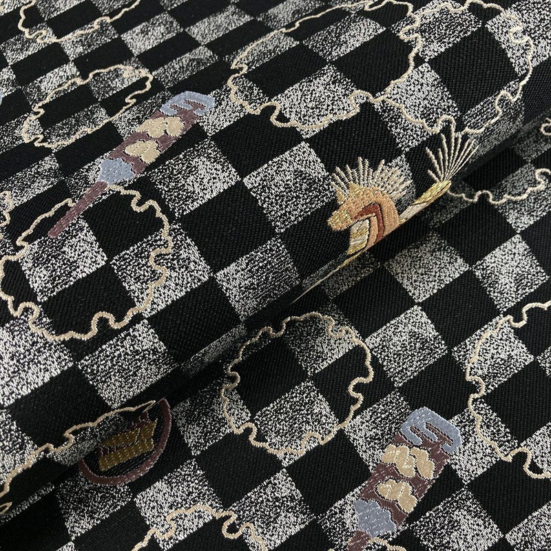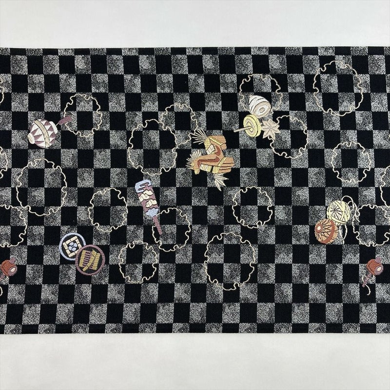 黒地に市松の地と雪輪、玩具文が織り込まれた楽しい意匠。