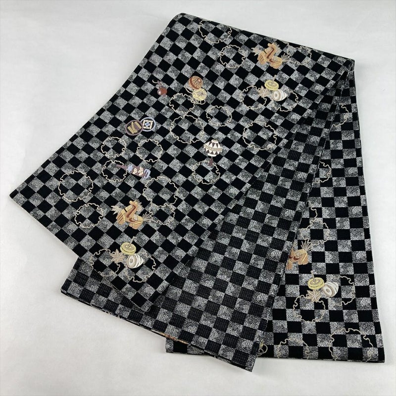 (中古)袋帯 黒 カジュアル 六通 織り 金糸 市松の地 雪輪 玩具文 絹