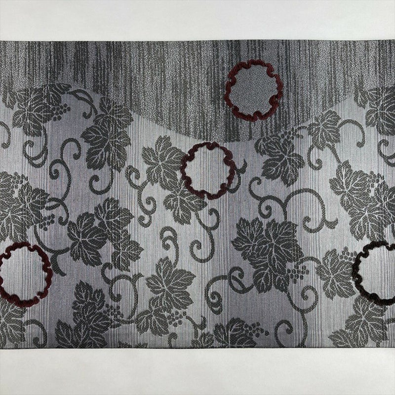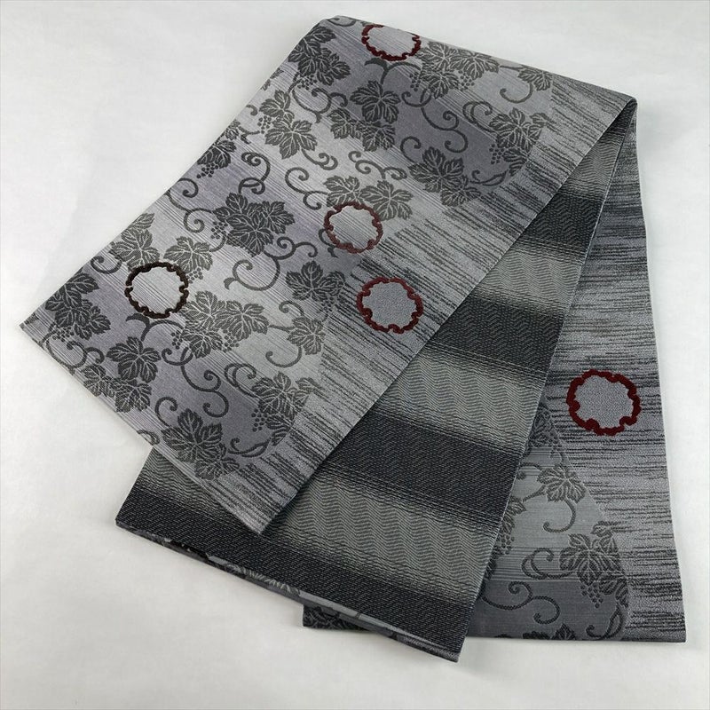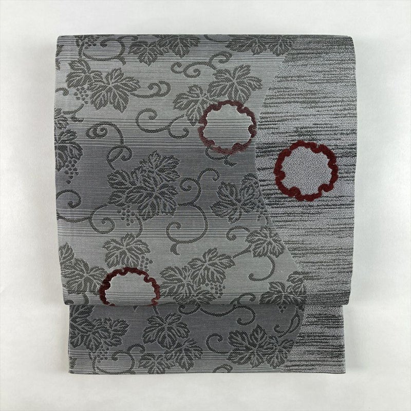 (中古)袋帯 グレー カジュアル 六通 織り 葡萄唐草 モール織りの雪輪 絹