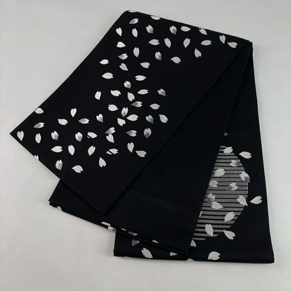 黒地に桜の花吹雪が舞う、上品な意匠の六通袋帯。