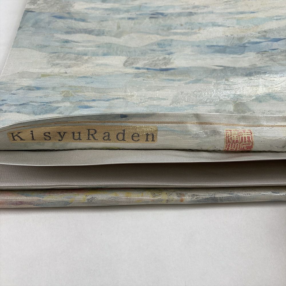 銀や薄水色の上品な色調に、紀州螺鈿の輝きが美しく映える六通袋帯。