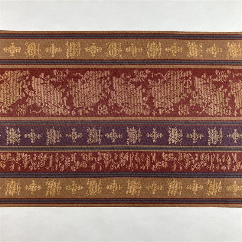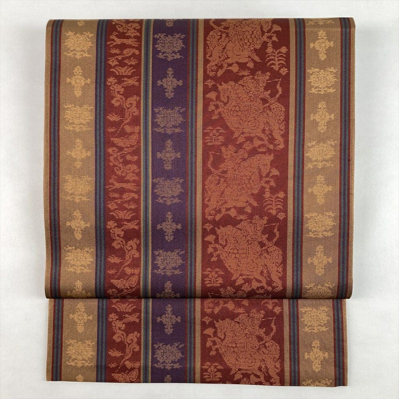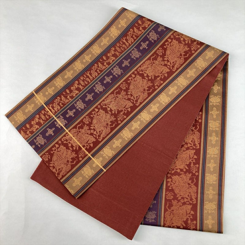 温かみのある赤茶地に、織りで表現された縞と馬のモチーフが軽やかに映えるカジュアル袋帯。