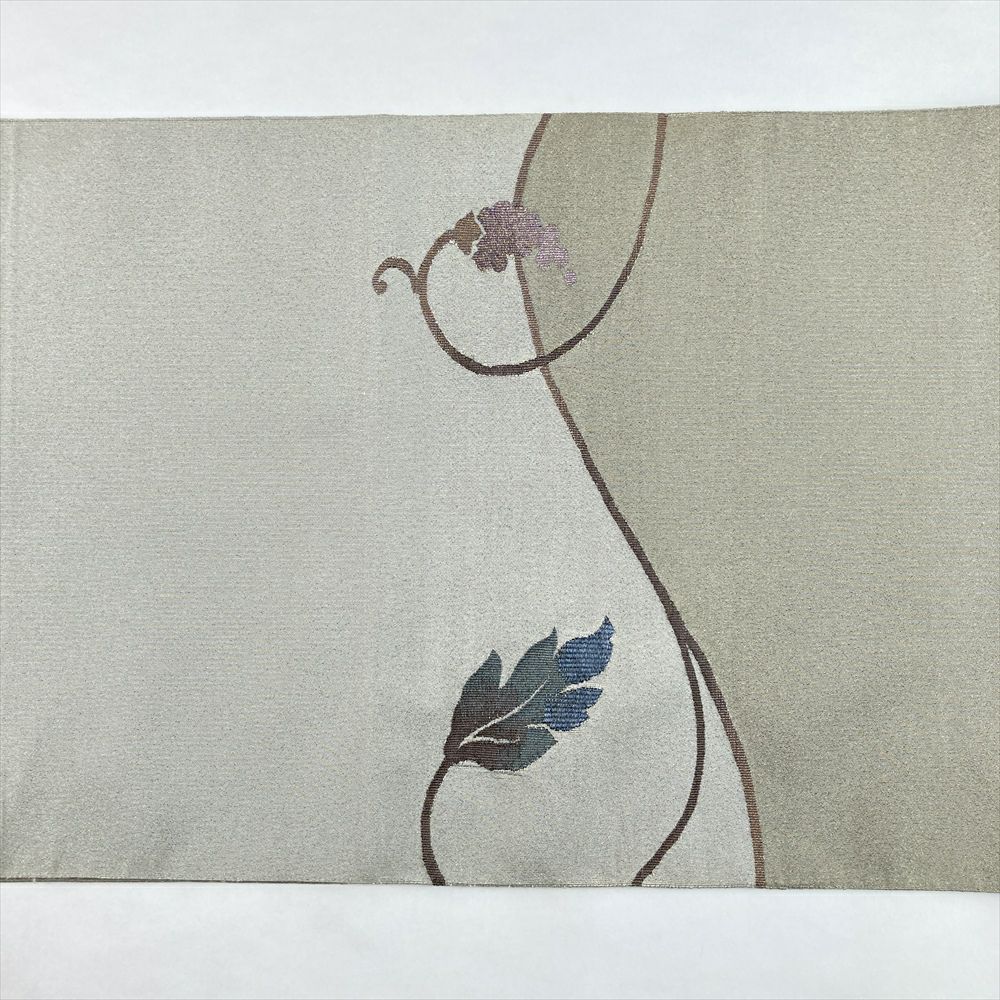柔らかな淡緑地に、織りで表現された葡萄と唐草模様が優雅に広がる袋帯。