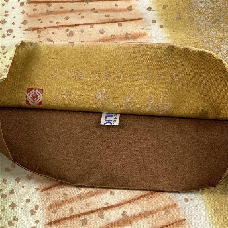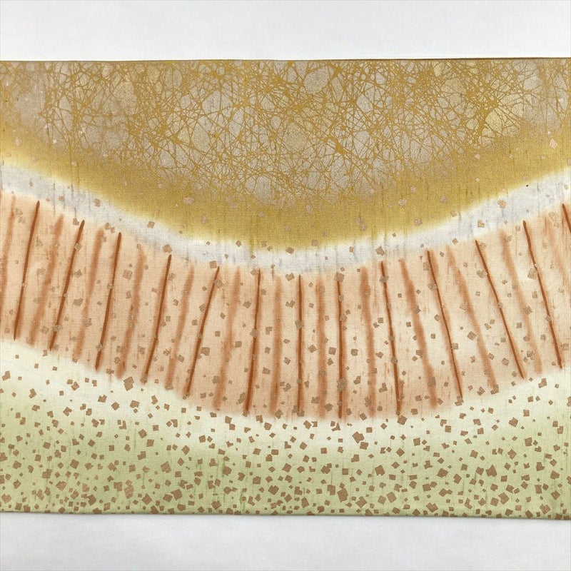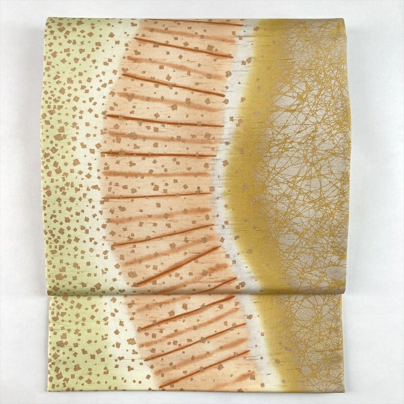 (中古)袋帯 芥子 黄 薄茶 カジュアル 全通 染め 金彩 干割れ 抽象柄 絹