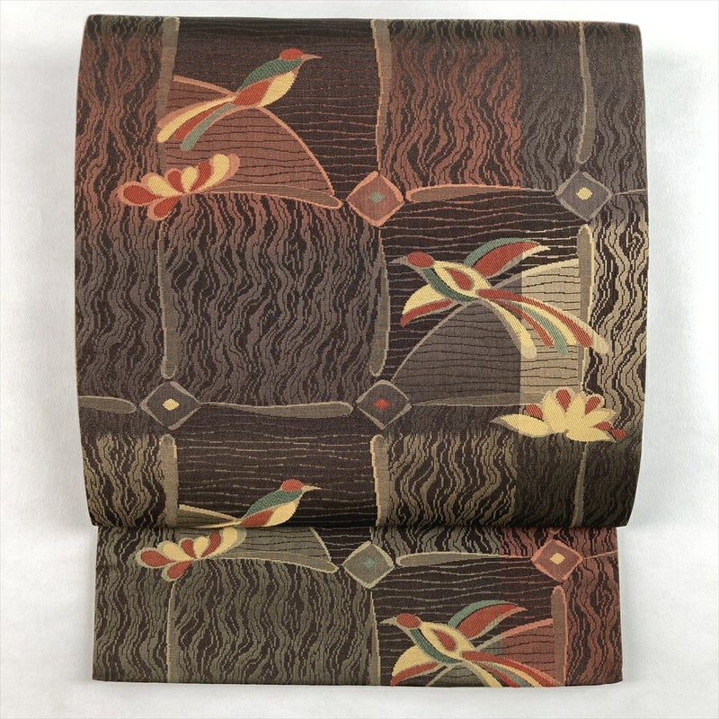 (中古)袋帯 焦げ茶 カジュアル 全通 織り 鳥 花 絹