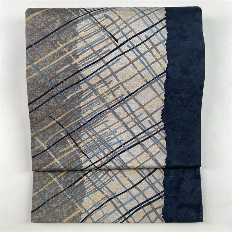 (中古)袋帯 グレー カジュアル 全通 牛首紬 染め 変わり斜め格子 絹