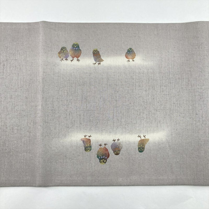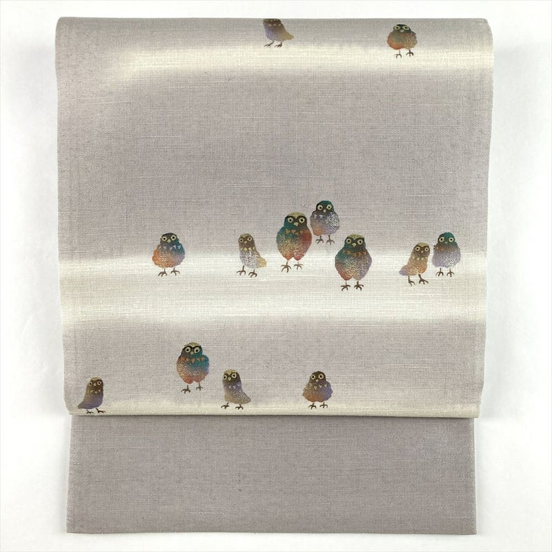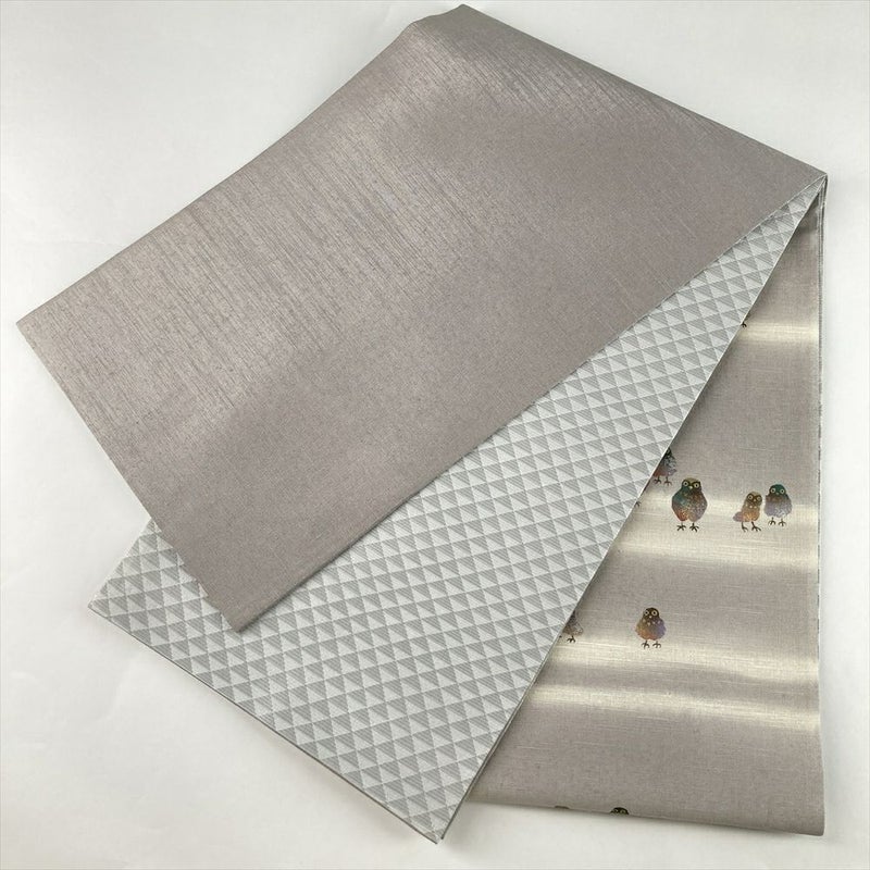 (中古)袋帯 グレー カジュアル 六通 銀糸 金彩 銀彩 梟 フクロウ 絹