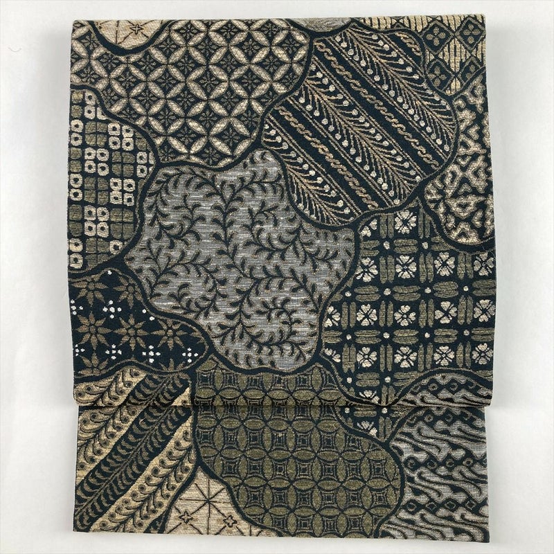 (中古)袋帯 深緑 カジュアル 六通 織り 寄せ柄 絹