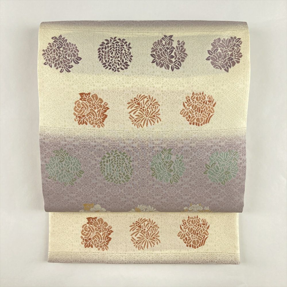 (中古)袋帯 クリーム 薄藤 紫 セミフォーマル 六通 織り 横段 四季花文 絹