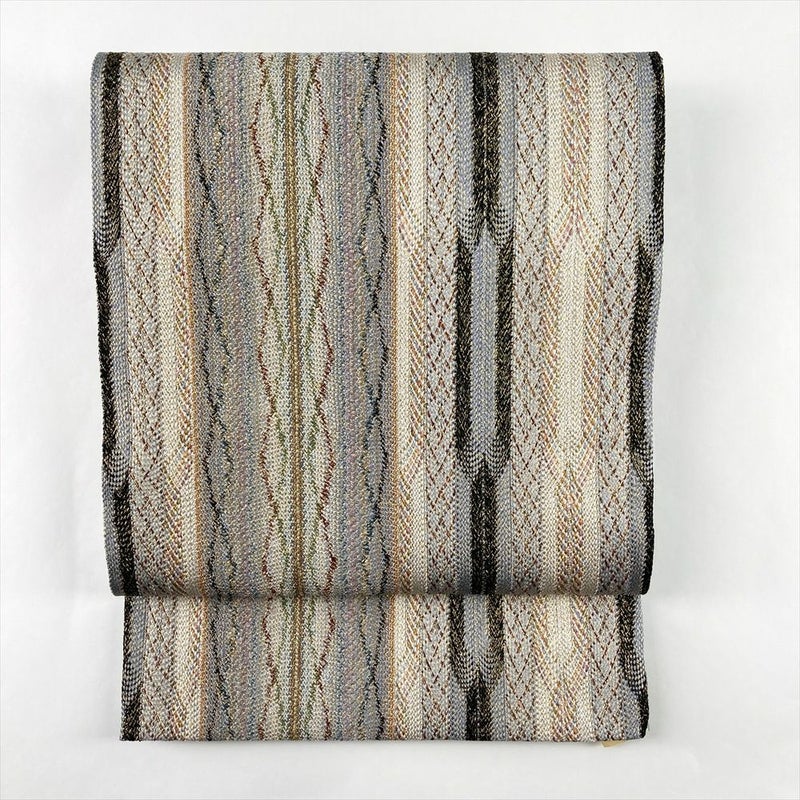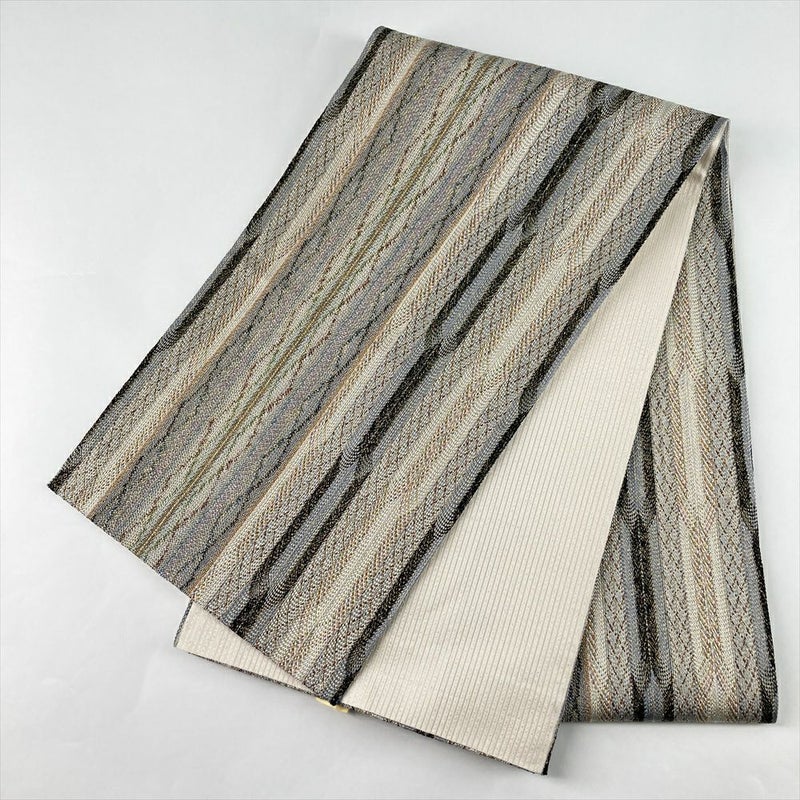 (中古)袋帯 白茶 灰 カジュアル 全通 組織り 縦に幾何学 絹