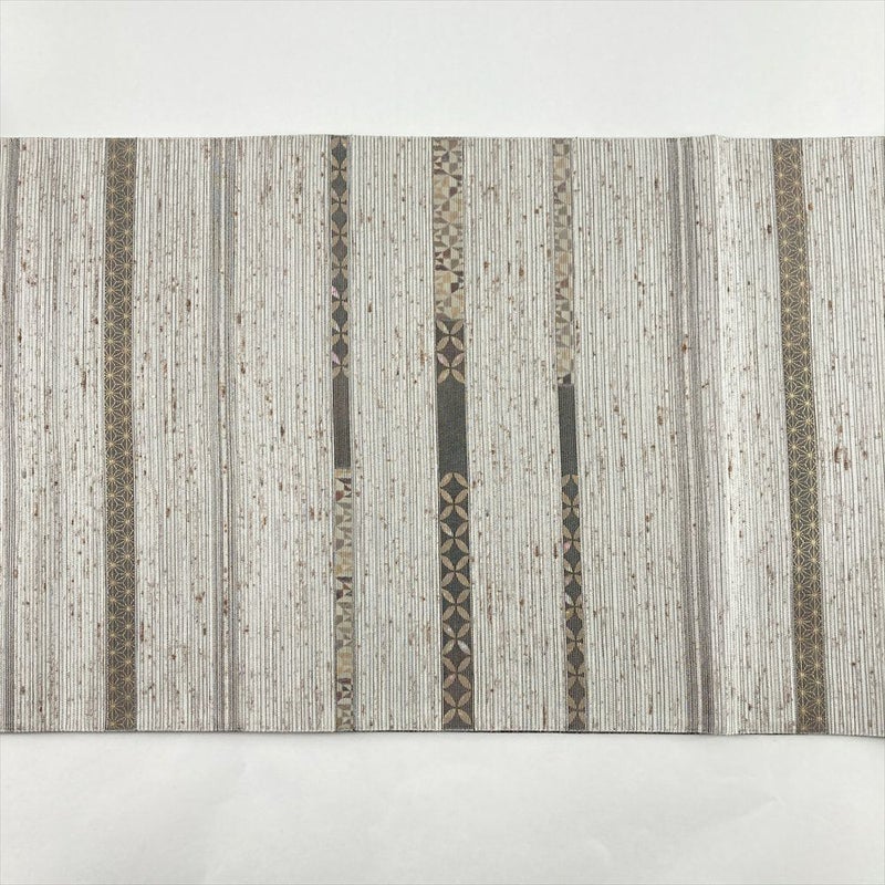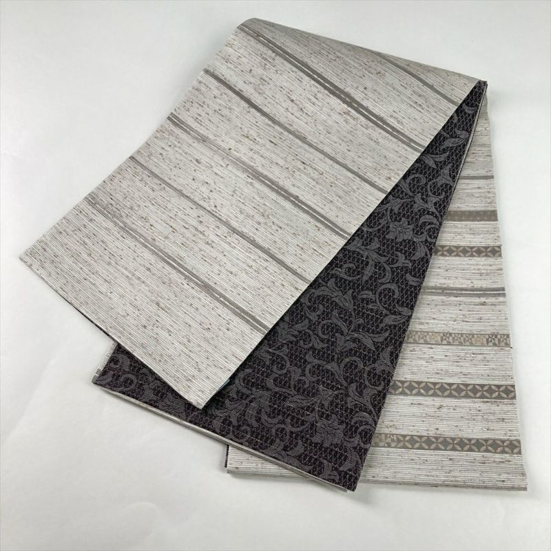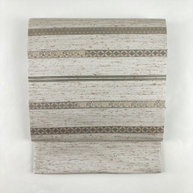 (中古)袋帯 薄灰 グレー カジュアル 六通 織り ぜんまい 横段 七宝 麻の葉 絹