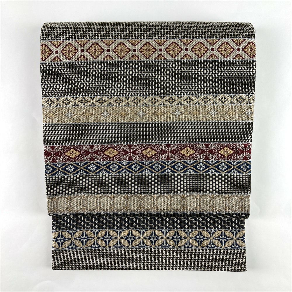 (中古)袋帯 墨黒 セミフォーマル 六通 刺し子織 横段割り付け文 絹