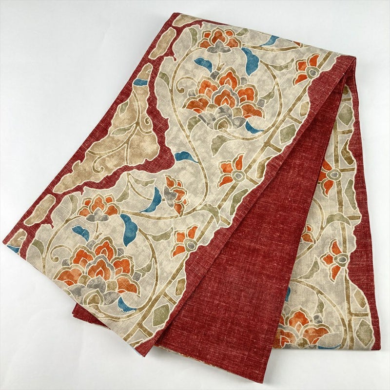 (中古)袋帯 白茶 臙脂 カジュアル 全通 染め 花唐草 絹