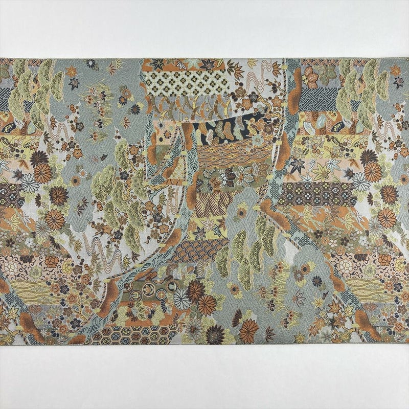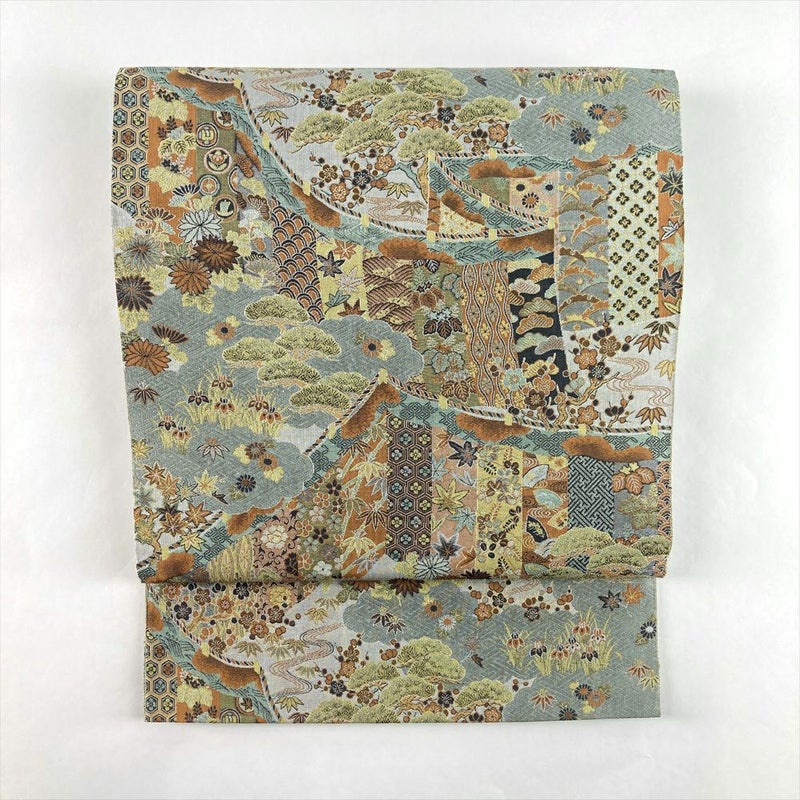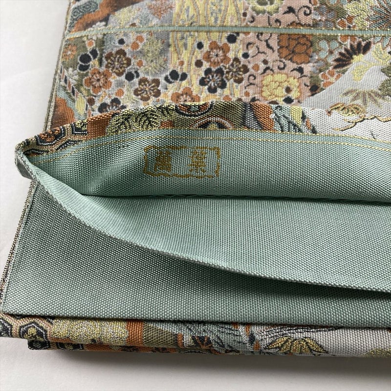 (中古)袋帯 薄緑 カジュアル セミフォーマル 全通 織り 幔幕 王朝 庭園 絹