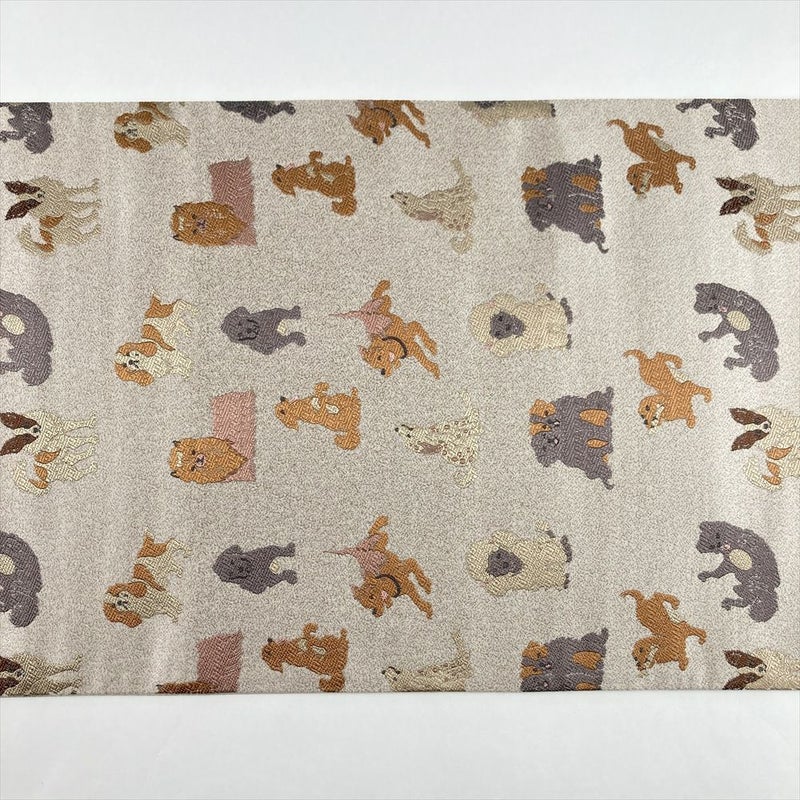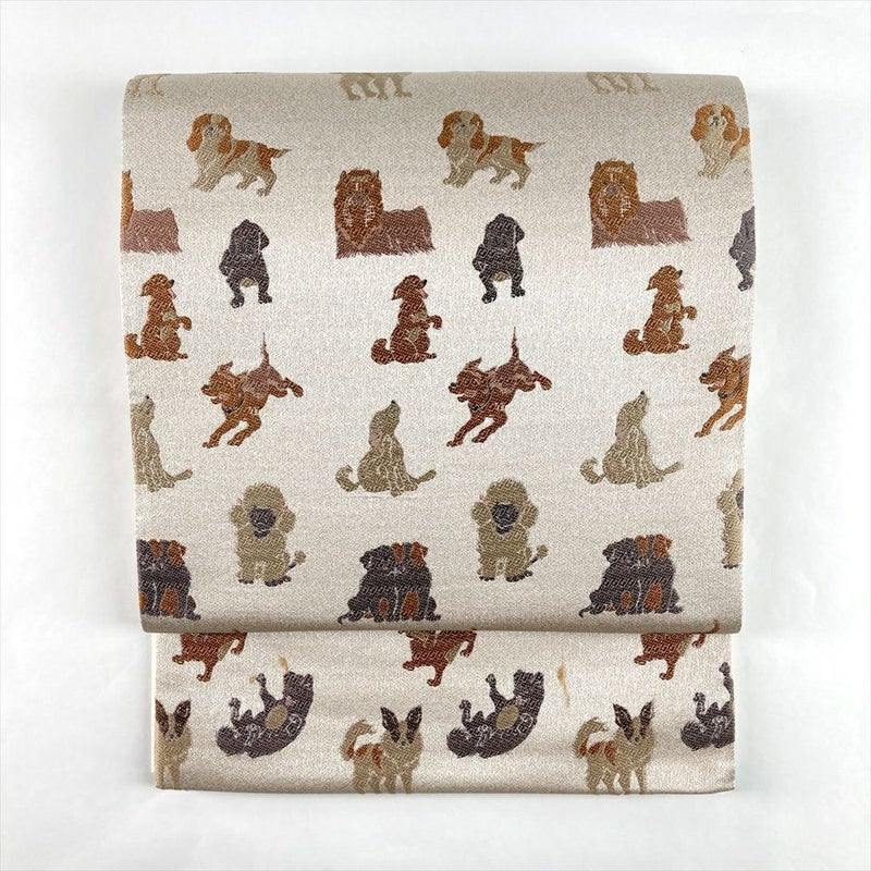 薄茶の地に犬のモチーフを織り込んだ、遊び心あふれる袋帯です。