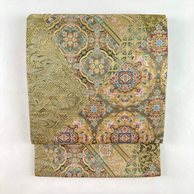 優美な鶯色の地に、金色を交えて天平文様を織り出した袋帯です。