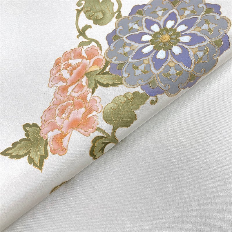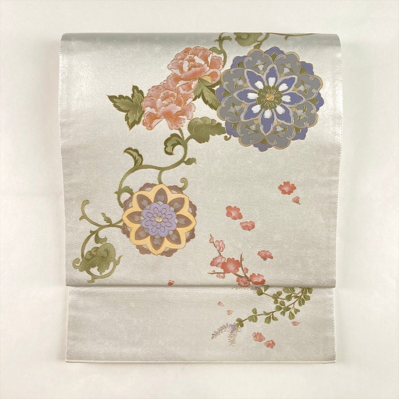 清涼感のある銀の地に、牡丹、桜、華文を金彩で贅沢に施しました。