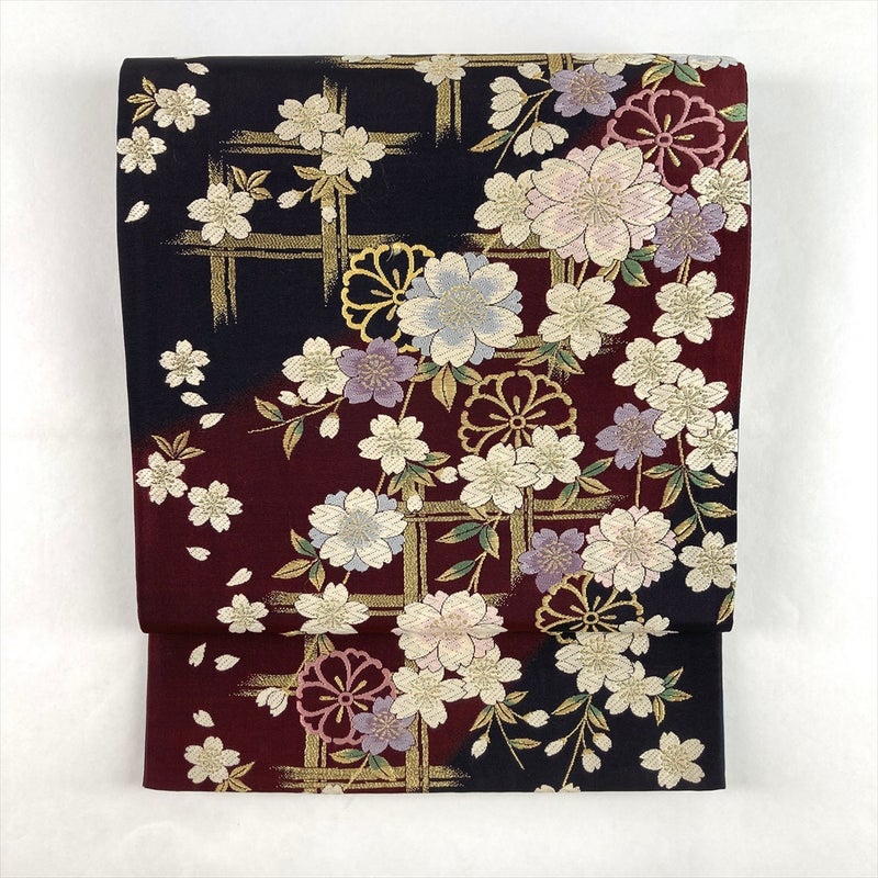 (中古)袋帯 黒 臙脂 セミフォーマル フォーマル 六通 織り 桜 絹