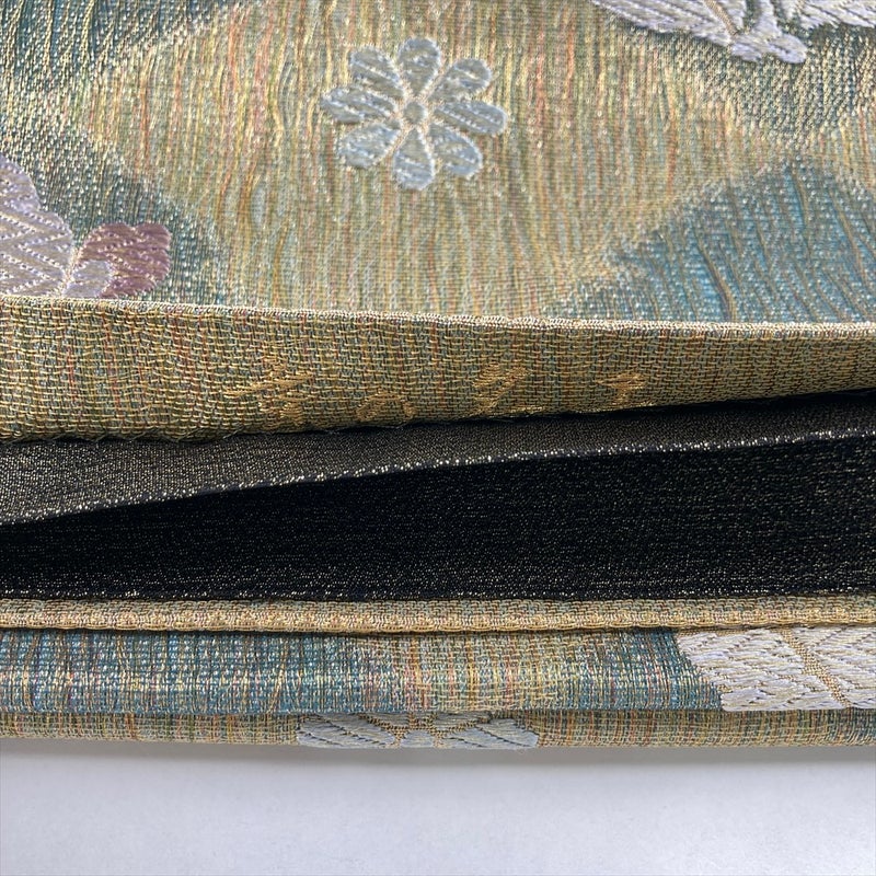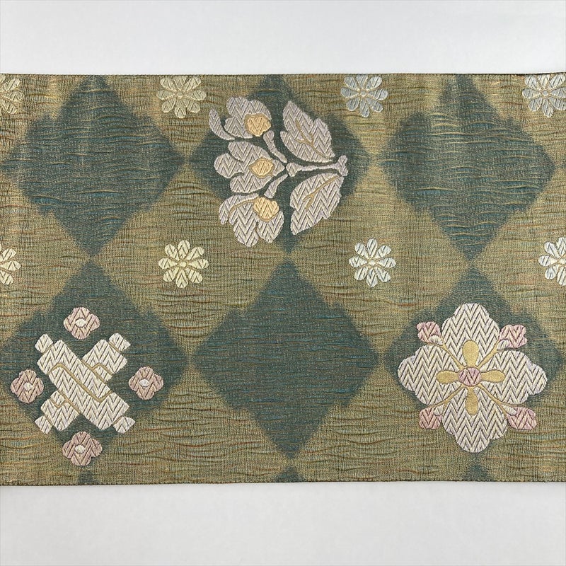 (中古)袋帯 金緑 セミフォーマル 六通 掬い織り 松皮菱 吉祥文 絹