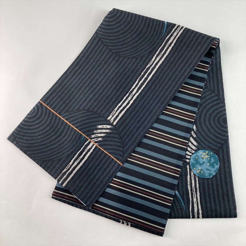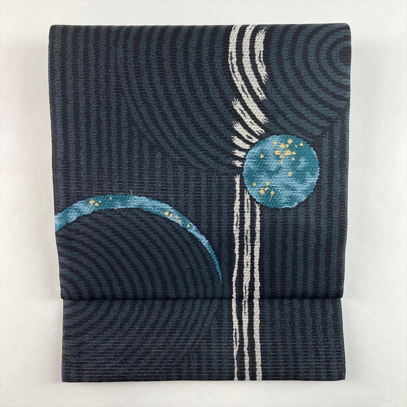 (中古)袋帯 灰青 黒 カジュアル 六通 織り 刷毛日月文 絹