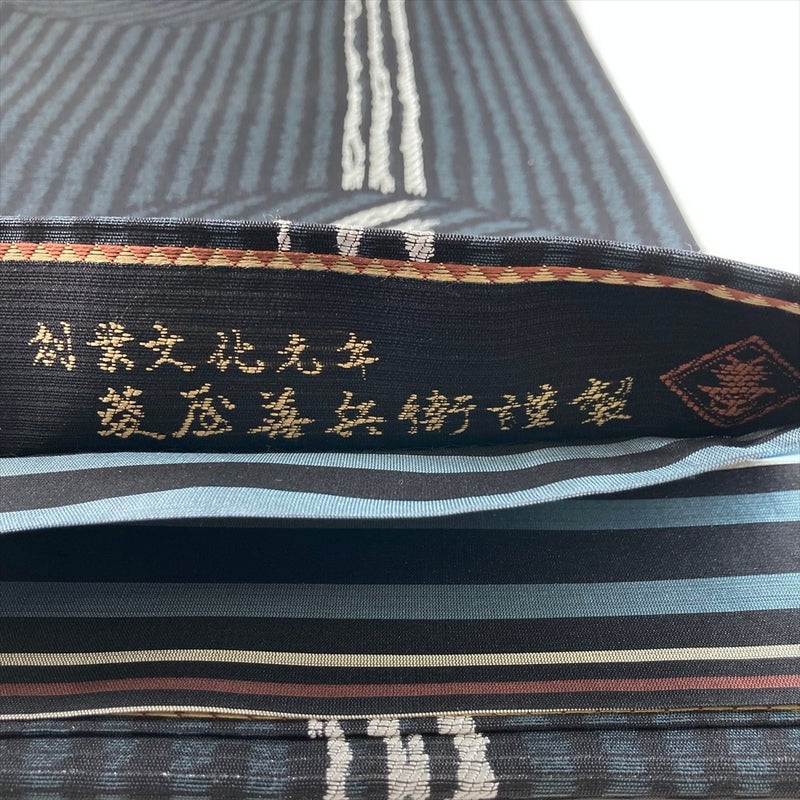 西陣・菱屋善兵衛の手による、青鈍の地に刷毛目月文を織り出した袋帯です。