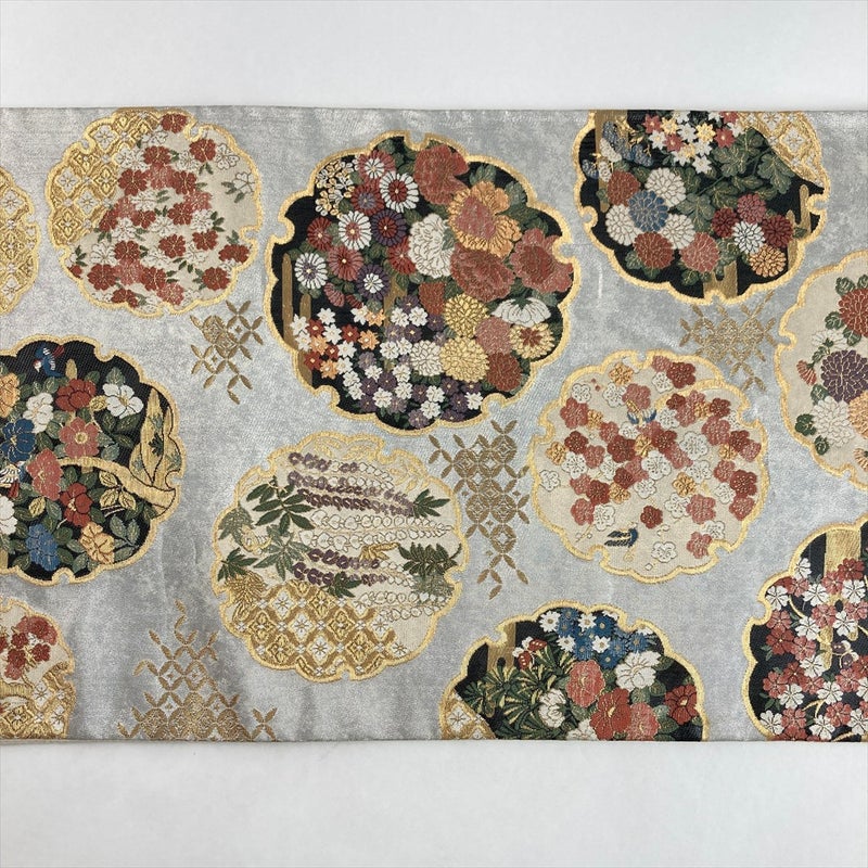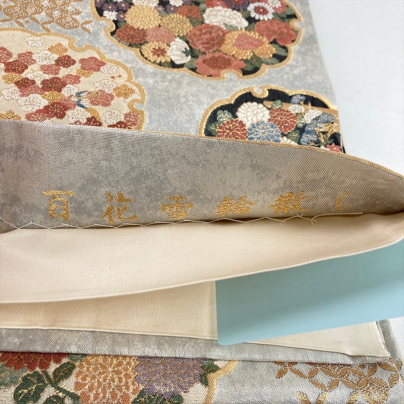 (中古)袋帯 銀 セミフォーマル フォーマル 六通 引き箔 四季花 雪輪文 絹