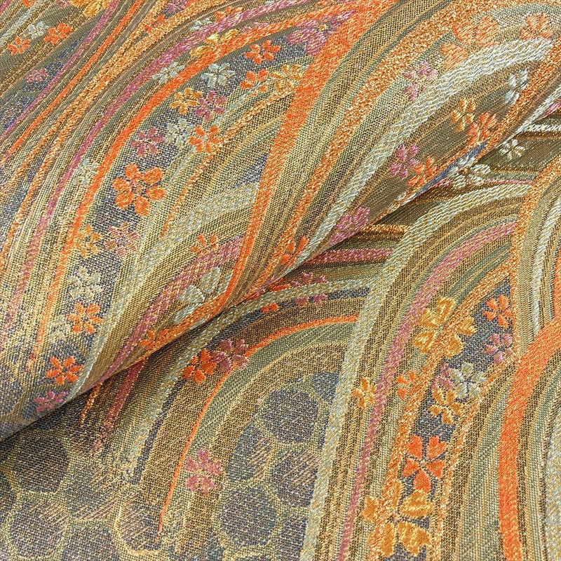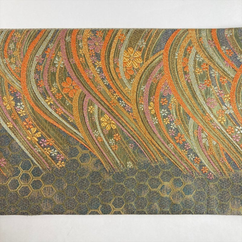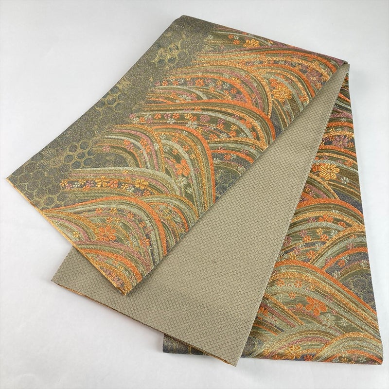 (中古)袋帯 金緑 セミフォーマル フォーマル 六通 金糸 波文 亀甲文 絹