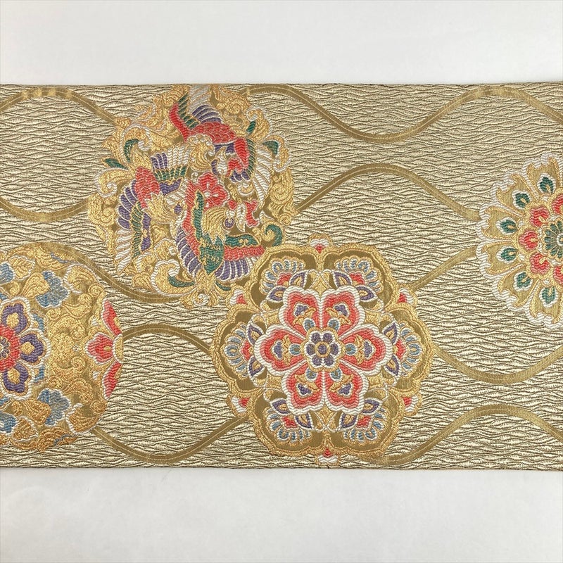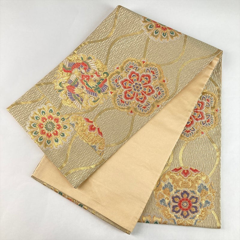 (中古)袋帯 金ベージュ セミフォーマル フォーマル 六通 織り 立涌 華文 鳳凰 絹