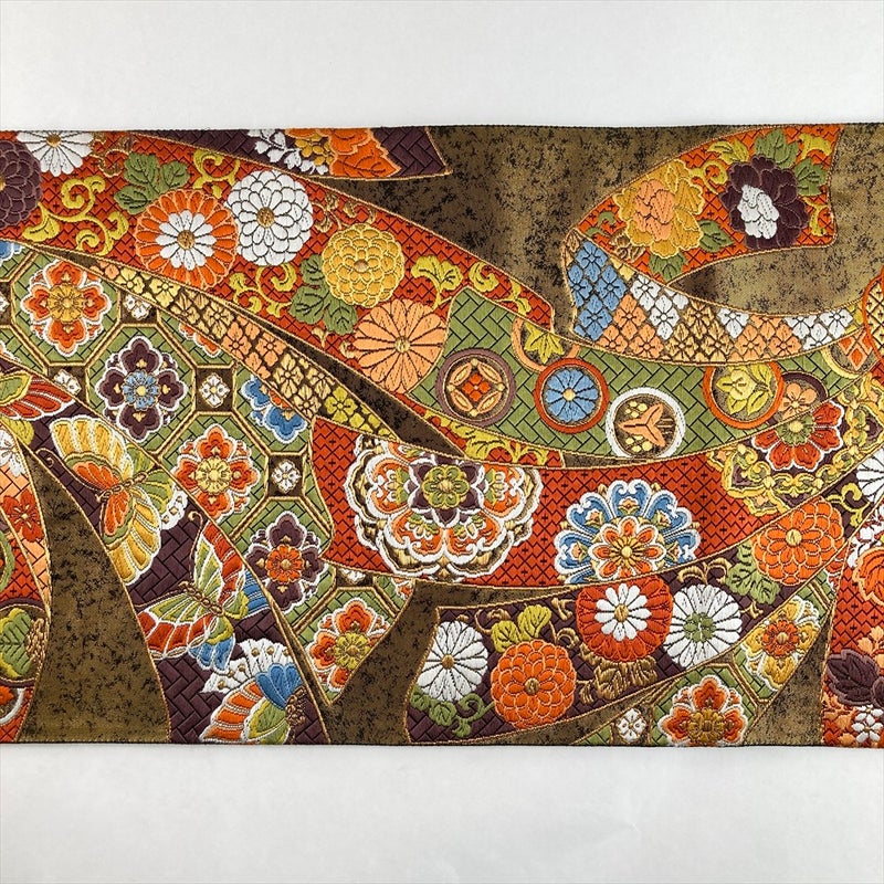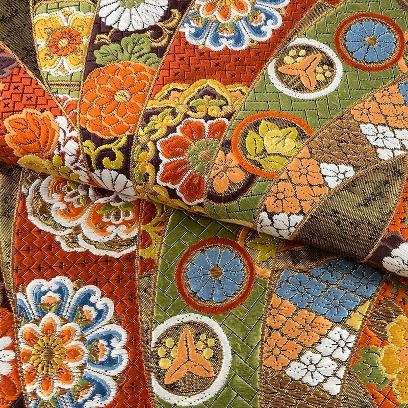 正絹ならではの重厚な光沢と、贅沢な彩りが織りなす佇まいは、お太鼓を作れば背中をドラマチックに彩ります。