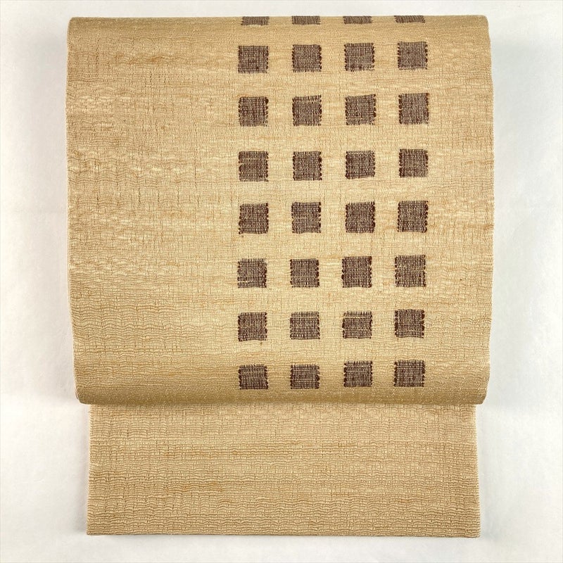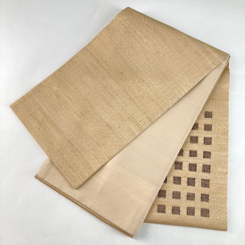 (中古)袋帯 薄茶 ベージュ カジュアル 六通 織り 抽象柄 麻