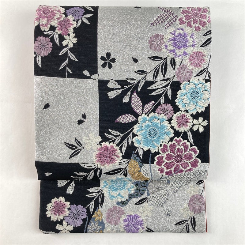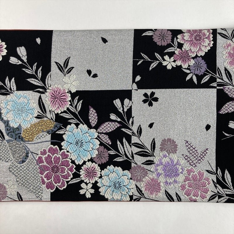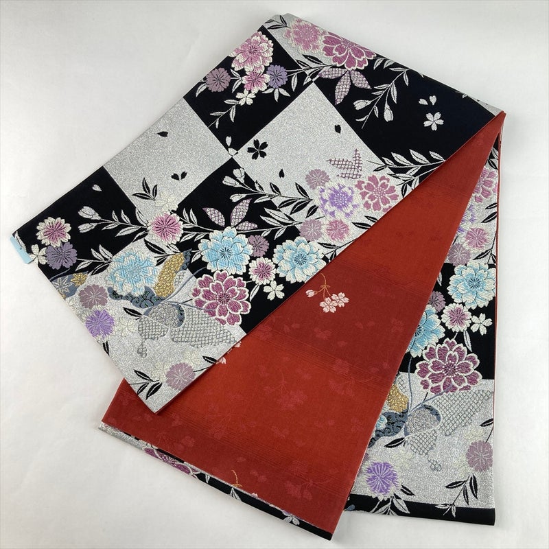 (中古)振袖用袋帯 銀 黒 セミフォーマル フォーマル 六通 織り 市松 桜 蝶 絹