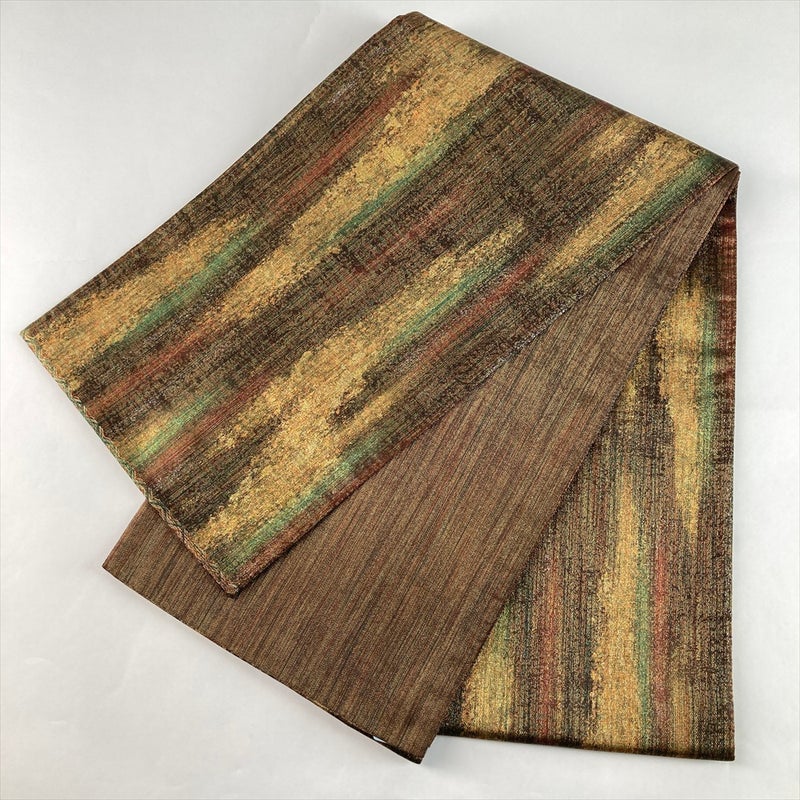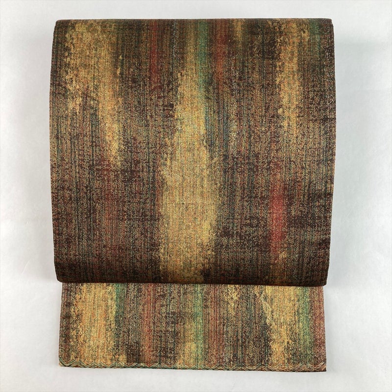 落ち着いた茶や深みのある緑、そして差し色の赤が、金の輝きと調和した洒落袋帯です。