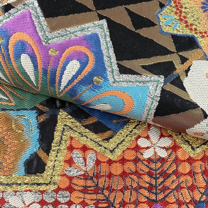 金と黒の鱗文様を基調に、色とりどりの花や植物をあしらった華やかなフォーマル向け袋帯。