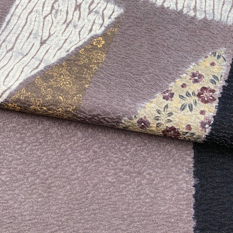 上品な灰紫色の地に、花唐草文様をあしらったセミフォーマル向け袋帯。