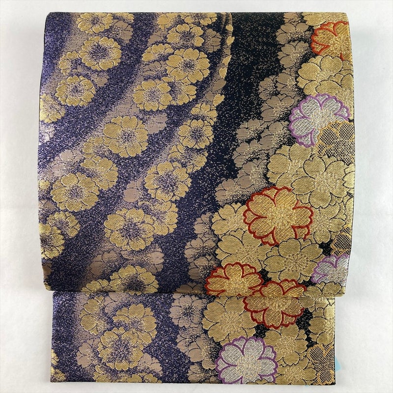 (中古)袋帯 金 青紫 黒 フォーマル 六通 織り 桜 ぼかし 絹