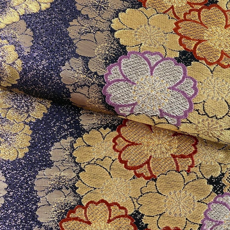 黒から青紫へと移ろう美しいぼかし地に、金の桜文様が華やかに浮かび上がるフォーマル向け袋帯。