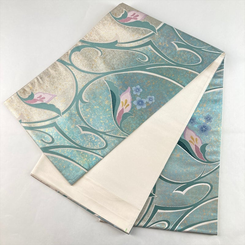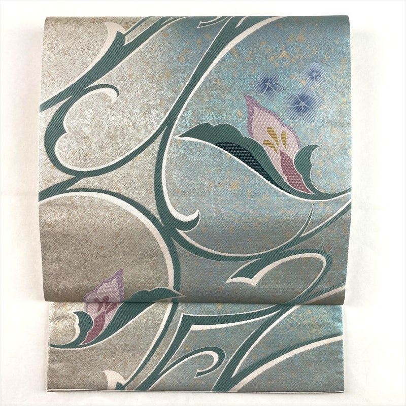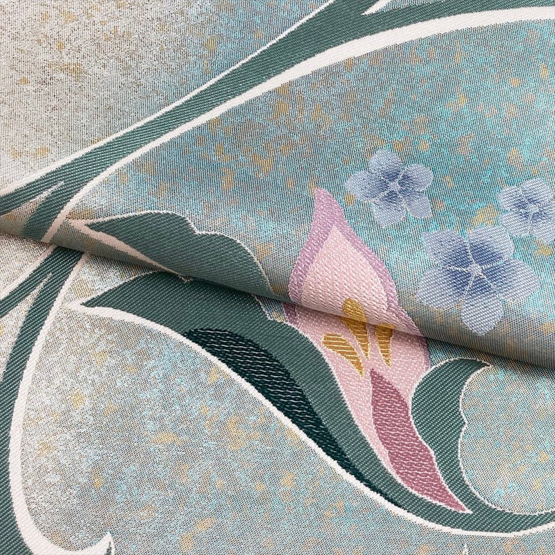 淡い薄緑と銀のぼかしがやさしく溶け合い、花と蔦の文様が品良く広がる袋帯。