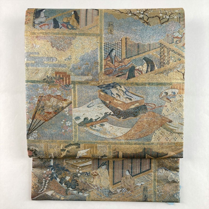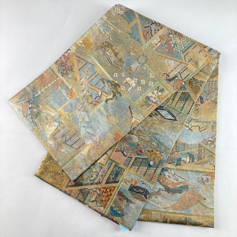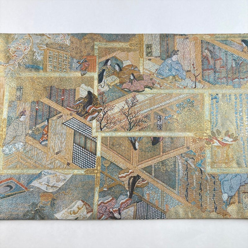 金緑に輝く地に、紫式部と『源氏物語』の雅な情景を織り出した、両面全通のフォーマル袋帯。